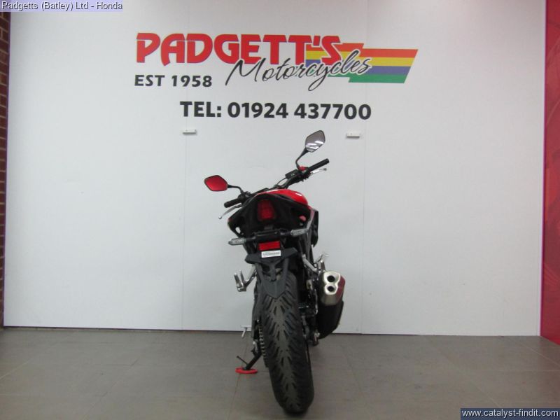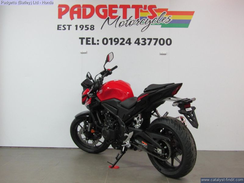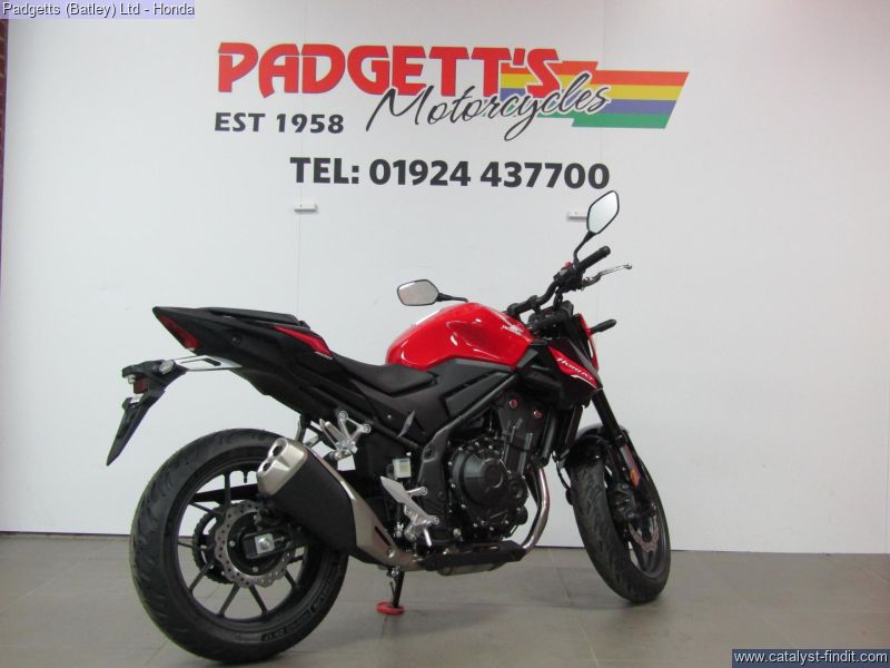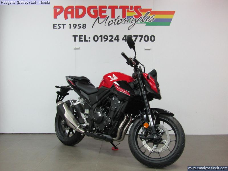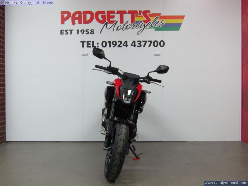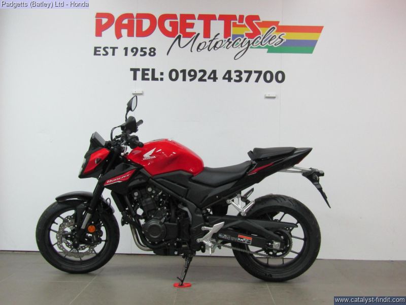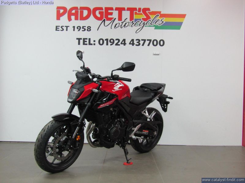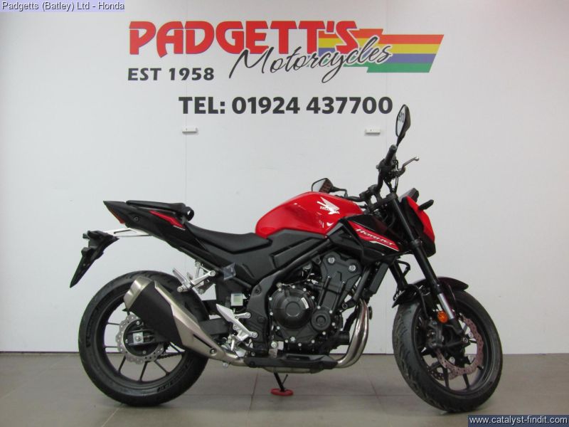 - We present here for sale this 2025 Honda CB500 Hornet. Ready for the riding buzz? You need our new CB500 Hornet. Aggressive, streetfighter style has big Hornet DNA coursing through it. Loaded with a responsive A2-friendly twin- cylinder engine and agile, high-quality chassis it’s built to whip through the city or twisting backroads. And premium tech – including full colour 5-inch TFT display, Honda RoadSync with on-screen turn-by-turn navigation – and HSTC rear grip management keeps you entertained, connected and safe. Join the hive. Command the Ride. Handle the city. With a naturally upright riding position that puts you in charge. Lightweight 5-spoke wheels, sporty aluminum swingarm and footpegs shave mass for super-fast, effortless steering. Dual 296mm discs and Nissin two-piston radial-mount calipers offer strong, progressive braking. Dialled-in Showa 41mm Separate Function Fork-Big Piston (SFF-BP) USD forks mean you can push hard into corners with all the feedback for grip you need. And then some. Get Noticed. A cut, low-set stance locks in the imposing street fighting attitude of a bike built to rip it up. Wide handlebars give the leverage and control to dodge through gaps, scorch corners, and open the visibility you need to be fully aware of what’s going on around. It pays to be seen in another way: they’ll see you coming thanks to a piercing new headlight and, for sure- thing cornering at night, the beam penetrates the dark with a wide light distribution. Make the Connection. This bike’s got your back. The 5-inch full-colour TFT display is all new, operated by a backlit switchgear with a very natural hand position allowing better visibility in all conditions. Both have been designed together for easy use, and the screen is engineered to minimise glare in bright sunlight. It also offers full connectivity through the Honda RoadSync app. A first in class, for Android and iOS smartphones, it means you can access on-screen turn-by-turn navigation, make and receive calls or listen to music while you ride. The bike is available for viewing and is well worth a look. Finance is available and is subject to status. Part Exchanges welcome. Nationwide delivery can be arranged from as little as £75. Usual Dealer Facilities including a Large range of clothing, helmets & accessories. Call Padgett's Motorcycles today to ensure that you don't miss out; Suzuki Sales Centre 01924 609808, Honda Sales Centre 01924 437700 and Yamaha Sales Centre 01924 478491. PLUS £180 OTR FEES