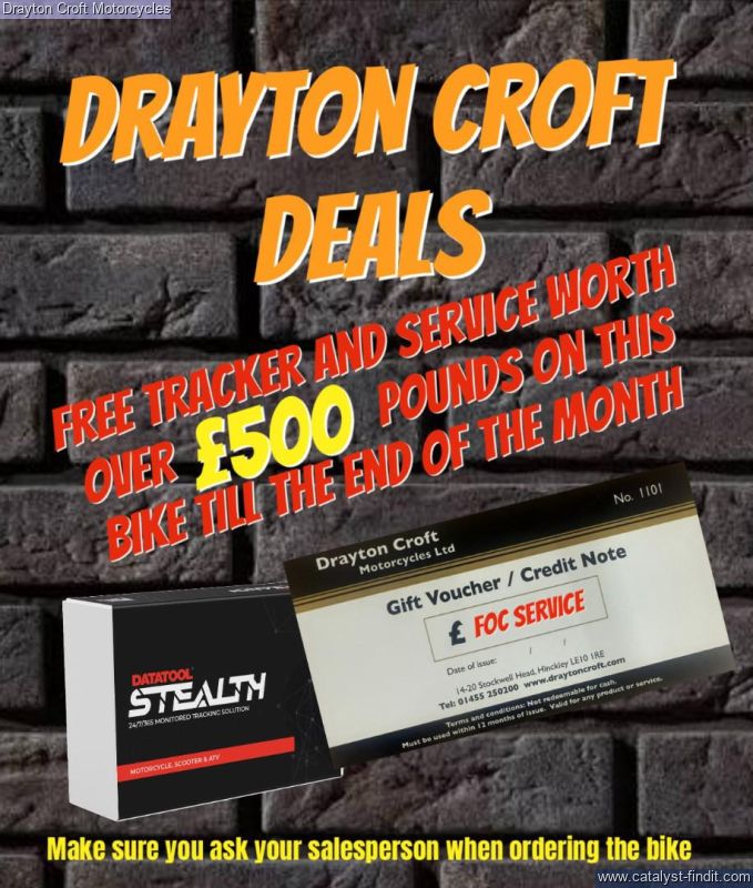 - All our bikes come with a HPI report and undergo a pre delivery inspection before they leave us, they also have 3 months mechanical warranty and 12 months MOT (if needed). * FINANCE AVAILABLE WITH MULTIPLE FINANCE COMPANIES, SUBJECT TO STATUS ** Please Contact Our Sales Department For More Details 01455 250 200 or Whats App message us on 07377 141398 And To Make Sure This Machine Is Still Available Before You Travel, or view this bike instore 9am to 5pm Monday to Saturday. Offering you over 200 New and Used Bikes, All Bikes can be reserved online 24/7 on our website www.draytoncroft.com we operate a fixed price policy - the price you see is the price you pay! No fees, no catches. We can also offer UK Mainland delivery. If you want to collect a bike and ride it home, we offer a customer collection service. Our knowledgeable sales personnel do not earn commission, so you won't get the hard sell. We want our customers to return to us time and time again, so we work hard to make sure you get the best bike for you, And if you want to part-ex, please contact us! We're happy to take motorbikes in part exchange! Motorbikes can be secured with a deposit of £200 over the telephone - 01455 250200. Deposits accepted via either credit or debit card, Final balances are to be paid via bank transfer/debit card instore. We also offer Servicing and MOT's instore Monday to Saturday with time slots available, Waiting is permitted in our waiting area with free Tea, Coffee and Biscuits. We also have a fully stocked clothing and accessories department instore too.