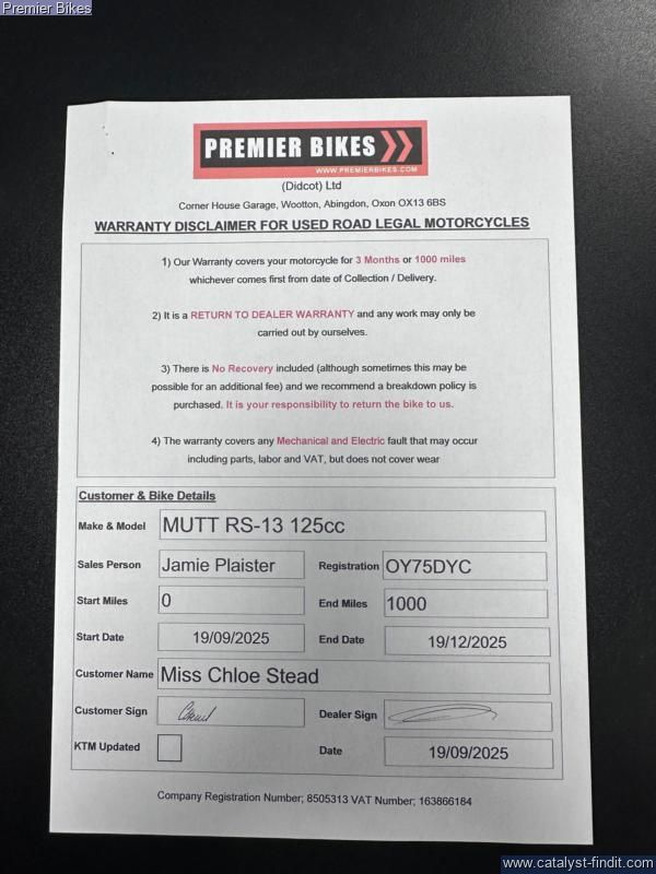 - We now have this Stunning One Owner 2025/75 Mutt RS-13 125. The RS-13 follows the classic Mutt stylistic approach - retro styling and riding experience with modern reliability and ease of operation. The 125cc air-cooled single-cylinder engine is housed in our tubular twin shock frame and feels like a much bigger bike, a perfect machine for carving up inner-city traffic or just as at home slamming through the twists and turns of the countryside. Running narrower handlebars for an upright aggressive riding position, it‚ perfect for hacking through the city traffic and that super bright halogen headlight lights up the road ahead with ease from behind the matt black grill. Keeping to it retro classic roots the RS-13 runs 18 wheels front and rear shod with super-fat, deep tread fat nobbly tyres. Please ask for any additional pictures or we can also offer a personal video presentation of the bike for you. Px very welcome, UK delivery can be arranged, Finance available (subject to your status), Call our experienced sales team now on 01235 519195 or email us at sales@premierbikes.com – Thanks for looking, Check out all of our other bikes at www.Premierbikes.com - Not all Bikes are on site, please contact us to arrange a viewing.