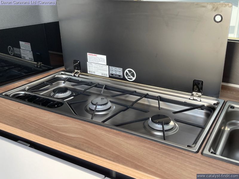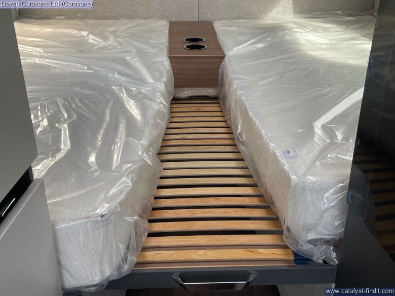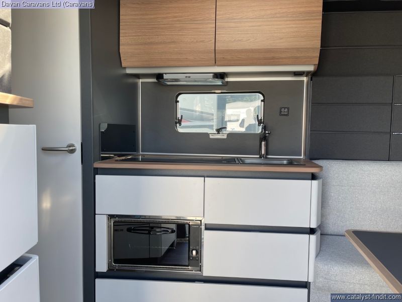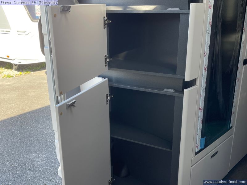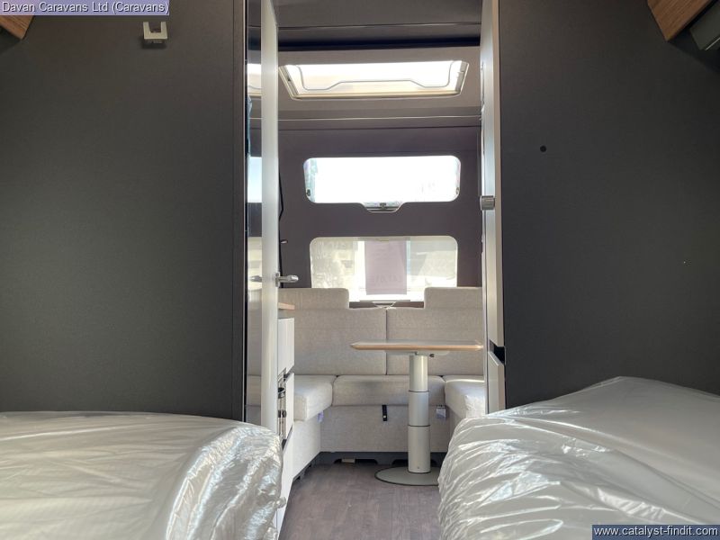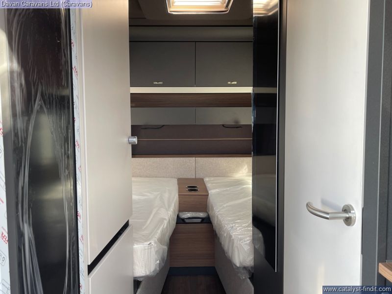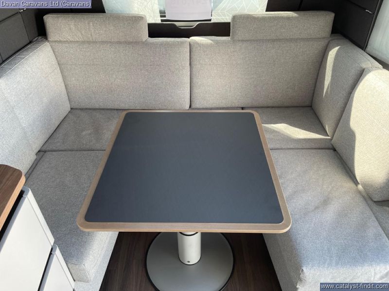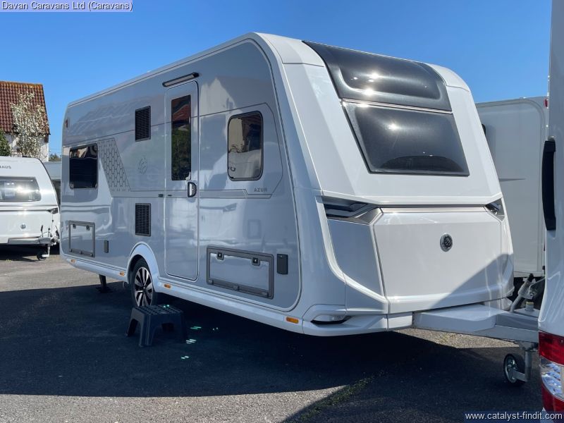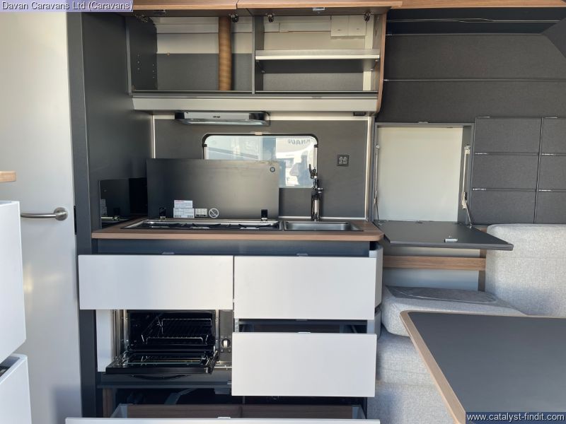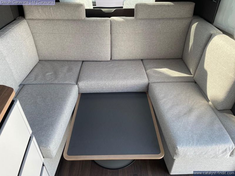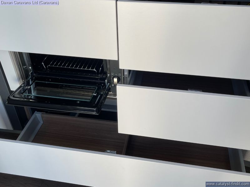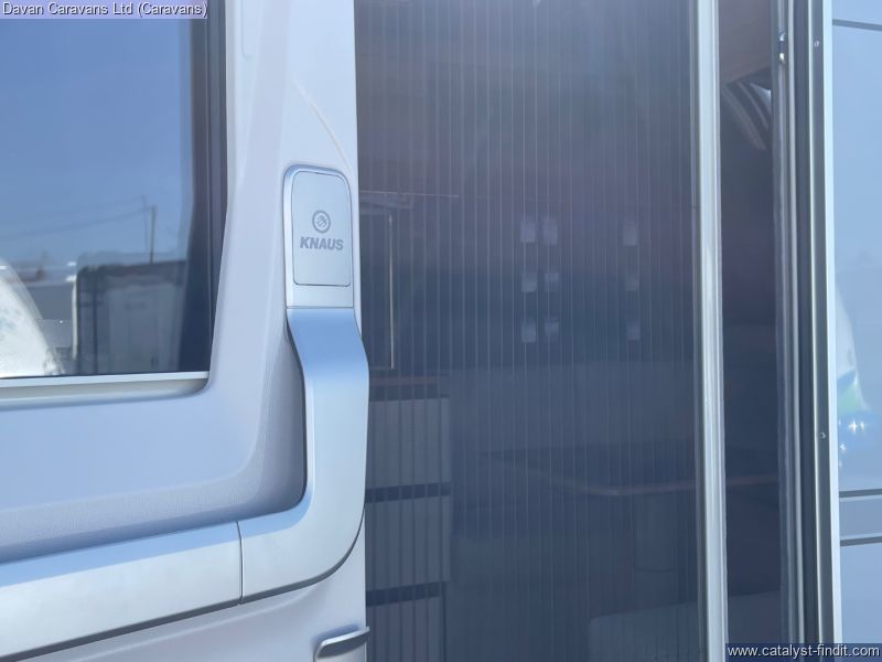 Enter the Knaus Premium habitation door, with wider frame, and lay eyes on a detailed interior from storage hidden in plain sight, easy-access under bench storage to generous worktops and a spacious lounge. You can ensure great meals from a 3-burner gas stove and a compact oven, adorned by plentiful cupboards. Serve to many or few with a grand dining table and comfortable U-shaped lounge - all under fully diffused LED lighting integrated into furniture and ceiling panels alike. Keep well stocked, in addition to thecupboards, with a large fridge freezer in easy reach of your worktop and central to the van. At the rear, two large single beds span the full width of the caravan. As standard, these can be converted to a truly royal full width-full length bed for the ultimate comfort with room to stretch out for the best nights sleep possible. As single beds, there is even a wooden infill with two cup holders for an integrated bedside table. Throughout, the Alde heating will keep you warm year-round thanks to Grade III insulated panels and also a hail-resistant roof. All of this and so much more with an Azur!