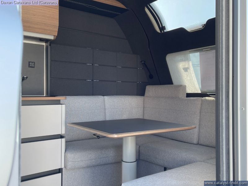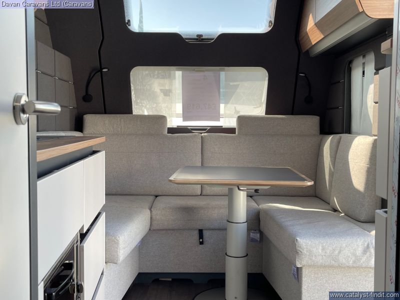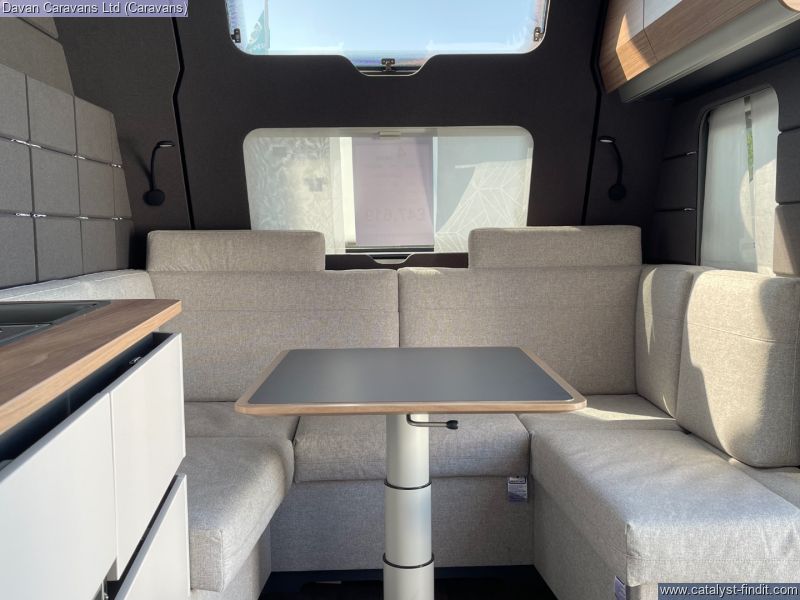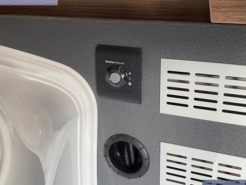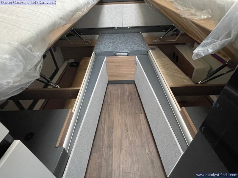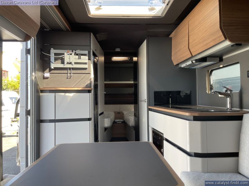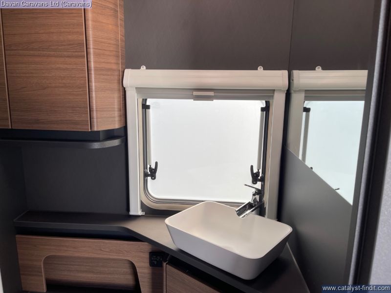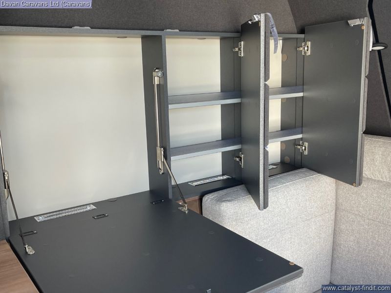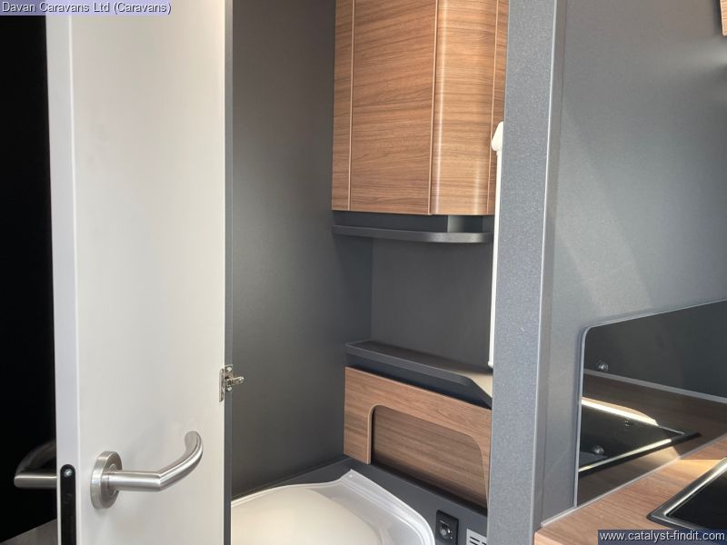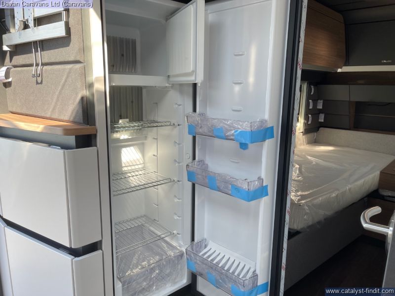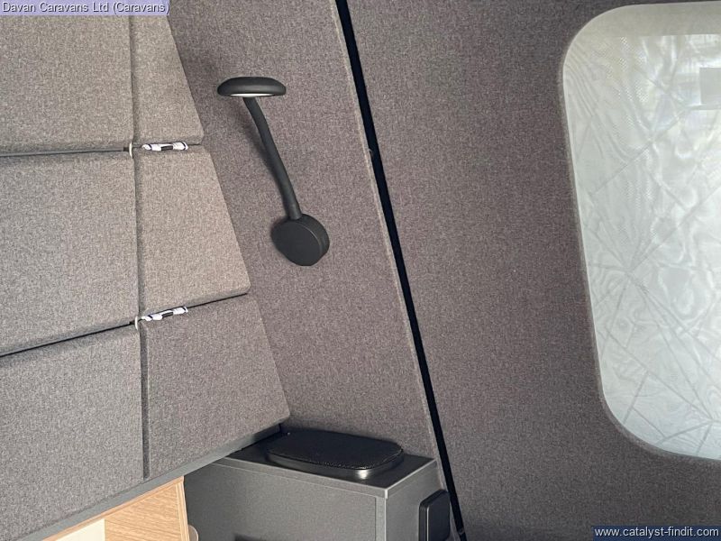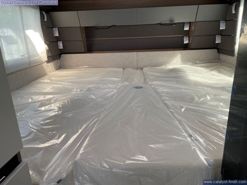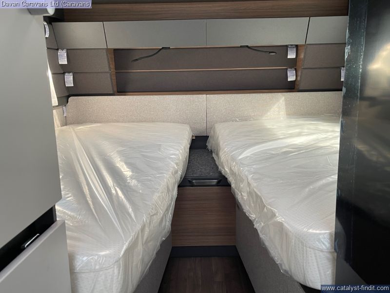 Enter the Knaus Premium habitation door, with wider frame, and lay eyes on a detailed interior from storage hidden in plain sight, easy-access under bench storage to generous worktops and a spacious lounge. You can ensure great meals from a 3-burner gas stove and a compact oven, adorned by plentiful cupboards. Serve to many or few with a grand dining table and comfortable U-shaped lounge - all under fully diffused LED lighting integrated into furniture and ceiling panels alike. Keep well stocked, in addition to thecupboards, with a large fridge freezer in easy reach of your worktop and central to the van. At the rear, two large single beds span the full width of the caravan. As standard, these can be converted to a truly royal full width-full length bed for the ultimate comfort with room to stretch out for the best nights sleep possible. As single beds, there is even a wooden infill with two cup holders for an integrated bedside table. Throughout, the Alde heating will keep you warm year-round thanks to Grade III insulated panels and also a hail-resistant roof. All of this and so much more with an Azur!