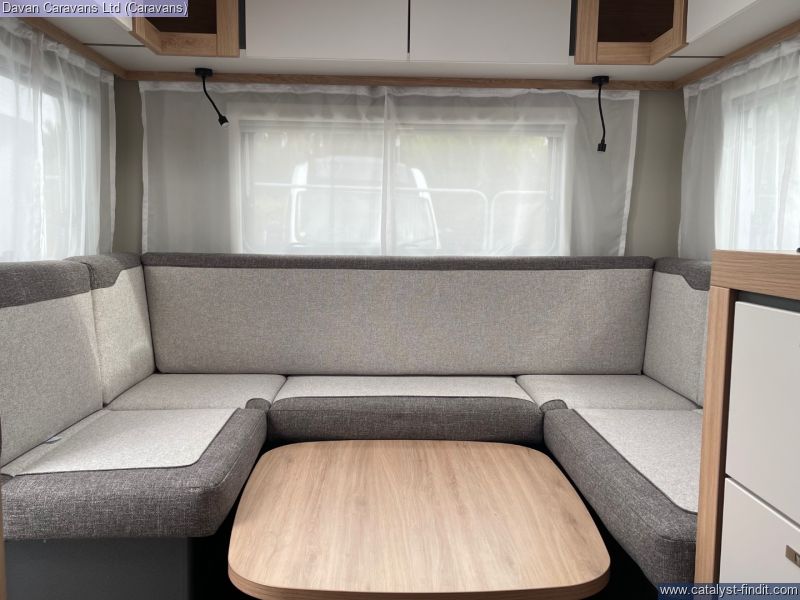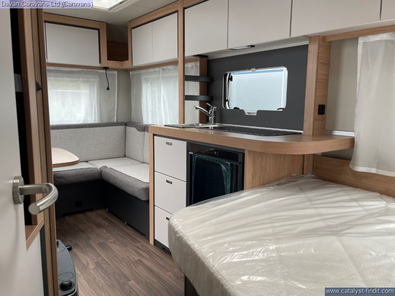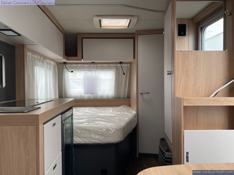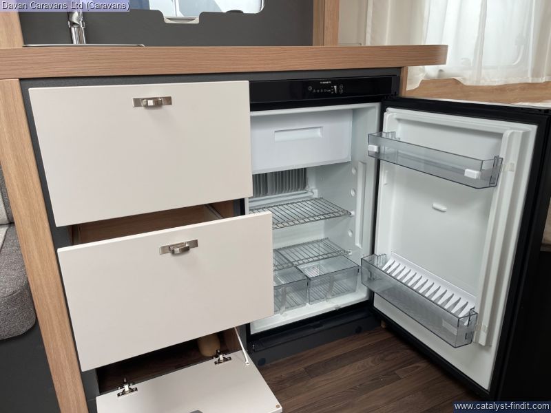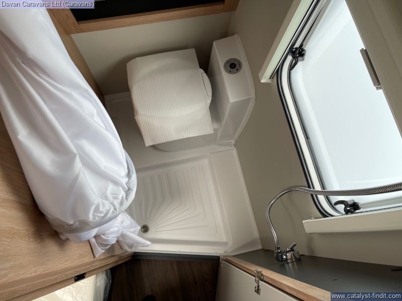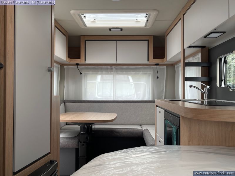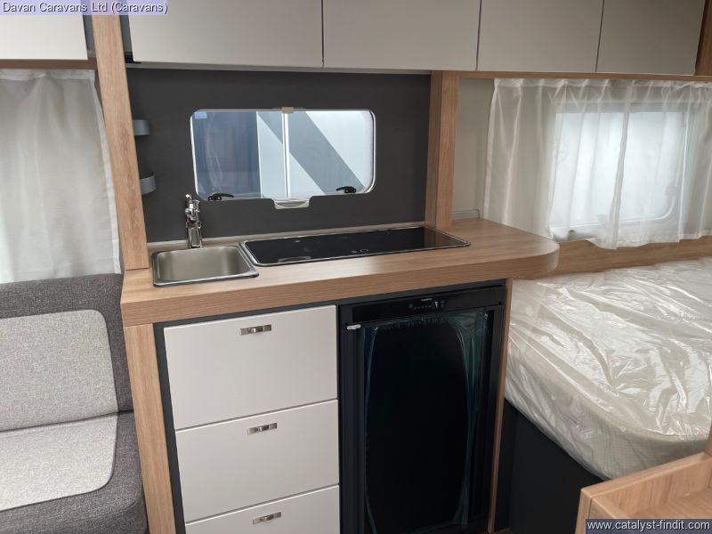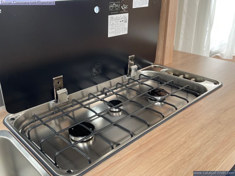 The central kitchen, though compact, is efficiently designed with a 3- burner gas hob, stainless steel sink, and an under-counter fridge. A functional washroom includes a swivel cassette toilet and shower facilities, with a convenient handbasin just outside. For added comfort, our model features optional Dual-fuel heating & Hot Water as well as loose-fit carpets, making it a cosy home on wheels.