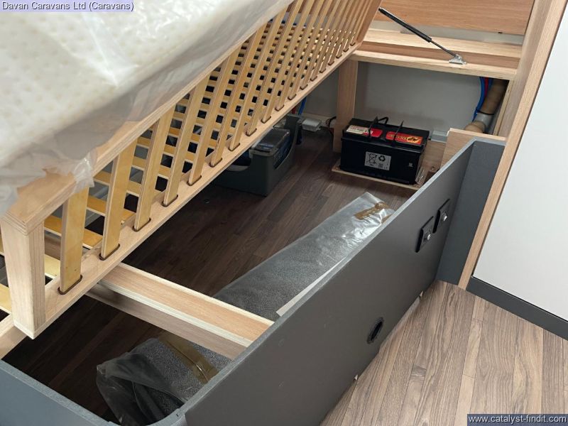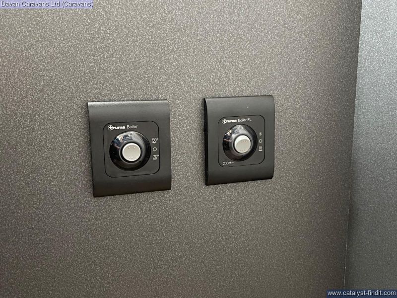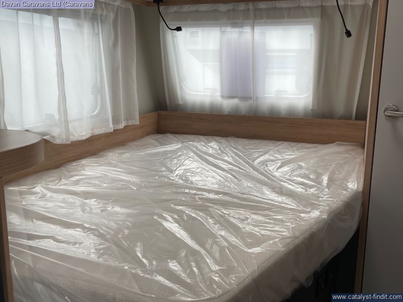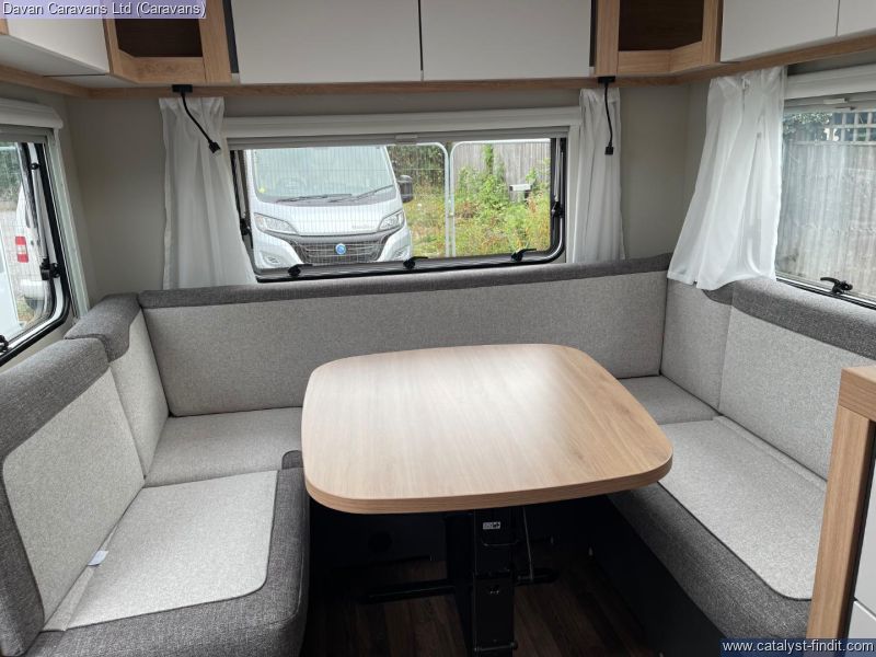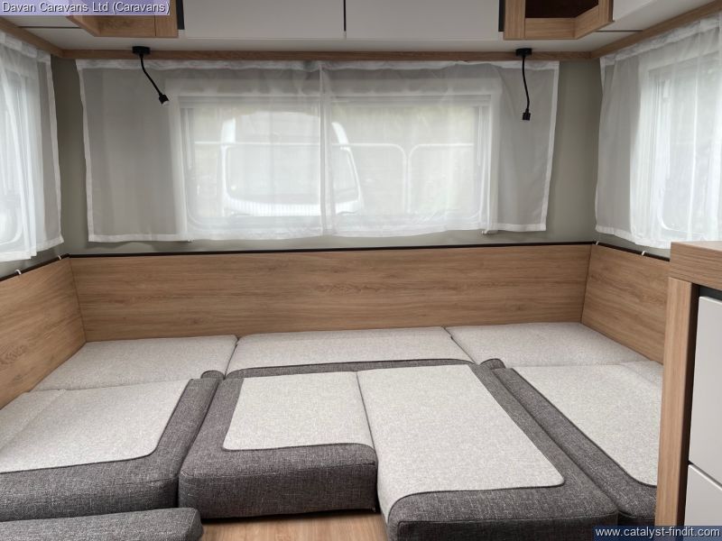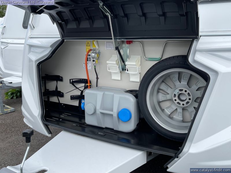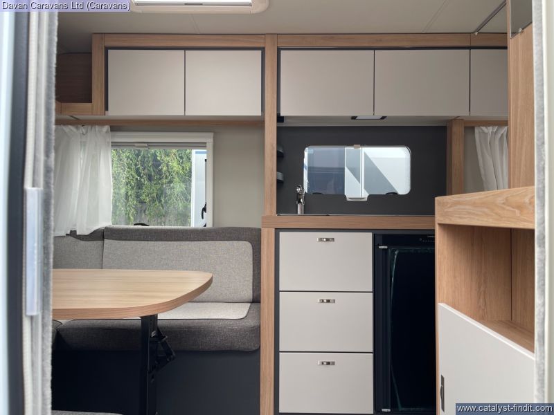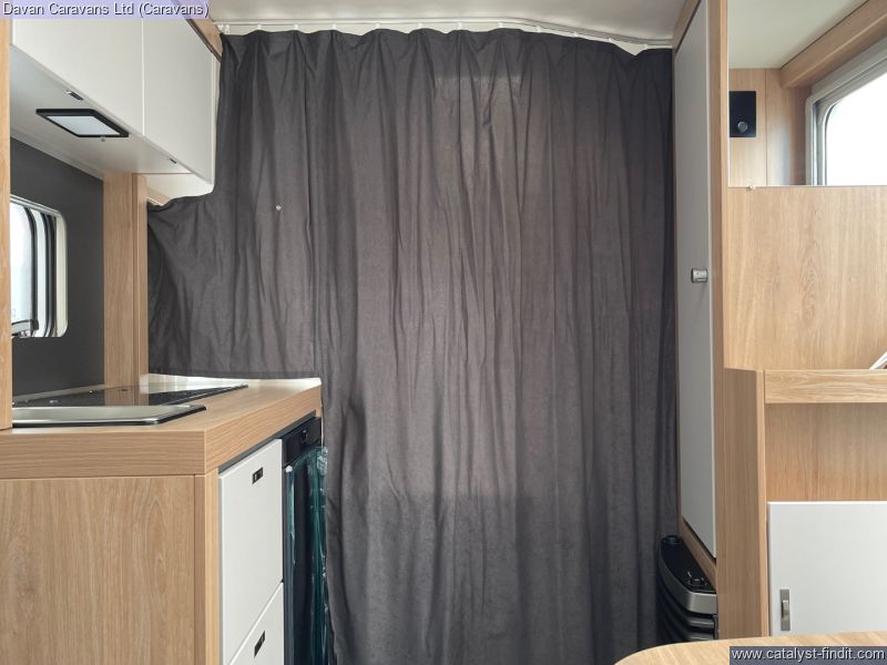 The central kitchen, though compact, is efficiently designed with a 3- burner gas hob, stainless steel sink, and an under-counter fridge. A functional washroom includes a swivel cassette toilet and shower facilities, with a convenient handbasin just outside. For added comfort, our model features optional Dual-fuel heating & Hot Water as well as loose-fit carpets, making it a cosy home on wheels.