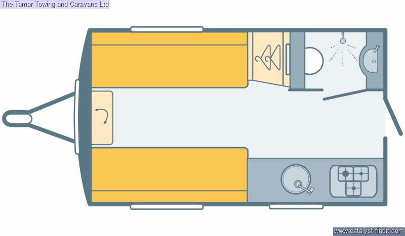 - The Basecamp 2 is a very popular 2 berth, compact caravan with a unique style. Designed for a couple who love the outdoors with flexible seating that will make into a large double bed. There is a good size kitchen with 3 burner hob, oven & grill. The fridge is a good size with freezer compartment. There is tall wardrobe for hanging space. There is a handy wetroom washroom with toilet, wash basin and shower.