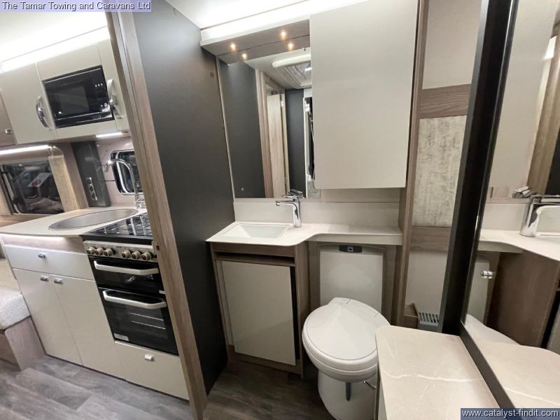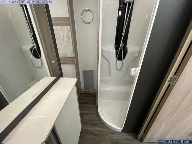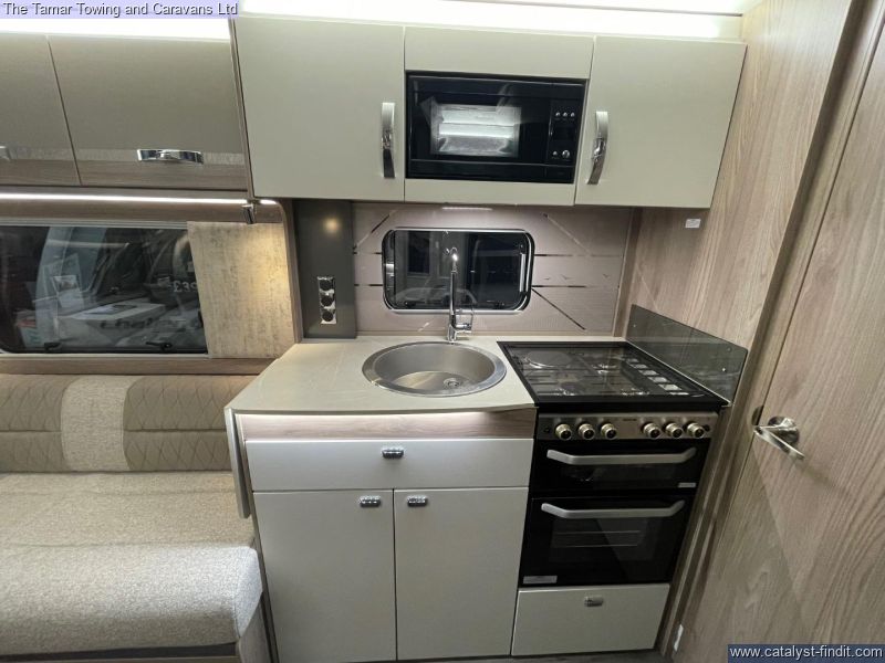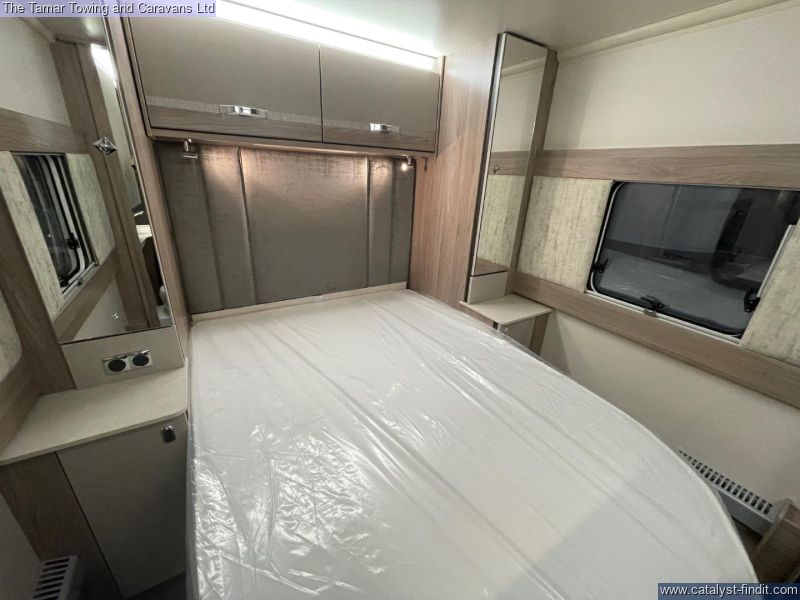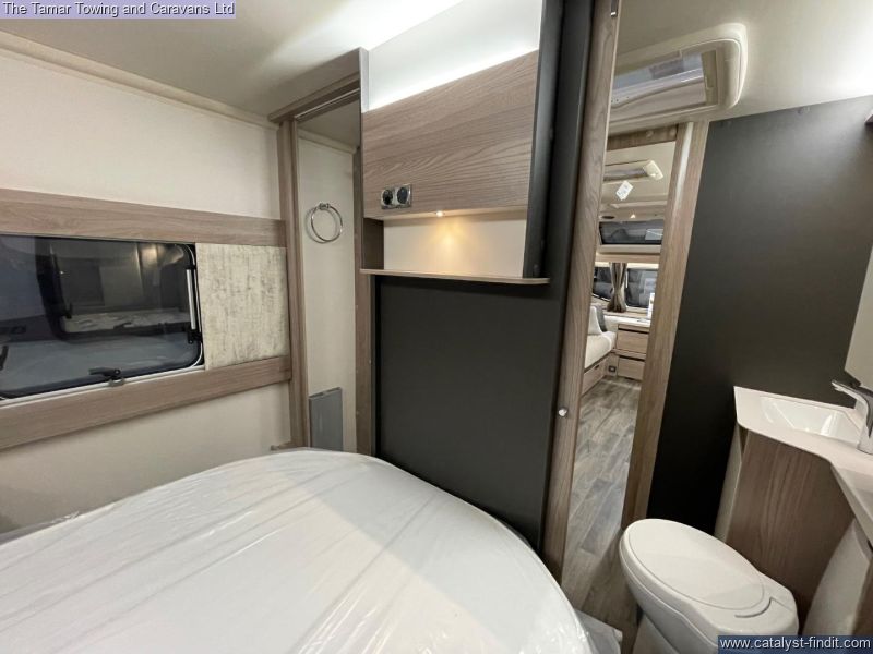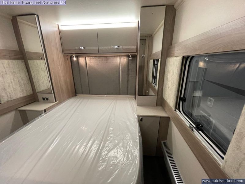 - The 650 is a twin axle 4 berth caravan in the standard 7'6" width. There is parallel seating at the front that will pull out to make a double bed. The kitchen is very well equiped with plateless microwave, oven, grill and 4 burner hob one of which is electric. There is also a tall slim fridge with freezer compartment. Step through the solid door to the central washroom with toilet, washbasin and seperate shower. At the rear through the sliding solid doors is the bedroom with a lovely island bed and Duvalay mattress. The bed will lift for storage. Either side of the bed is a wardrobe and above the bed are two overhead lockers.