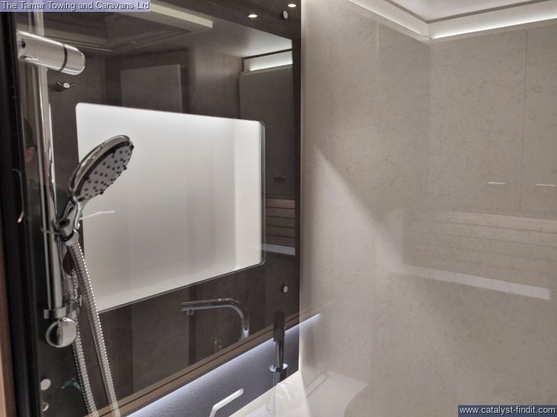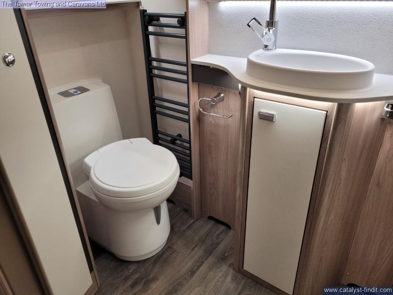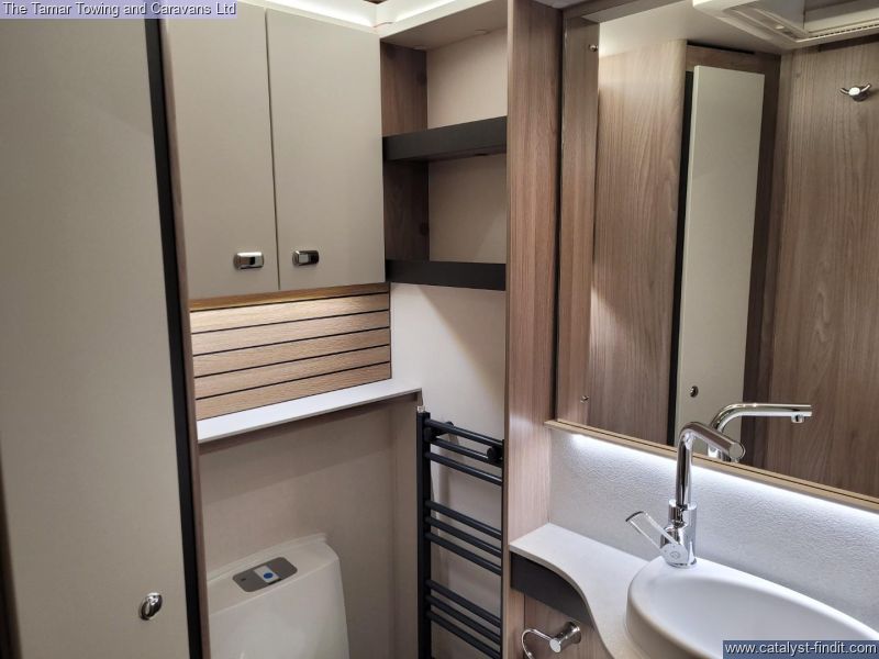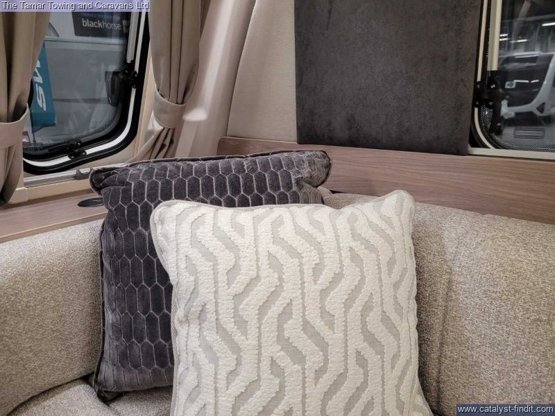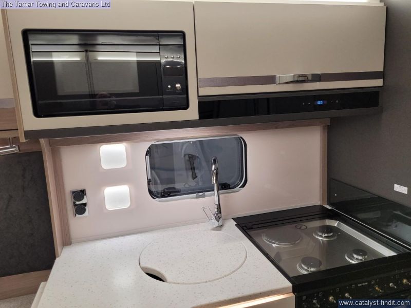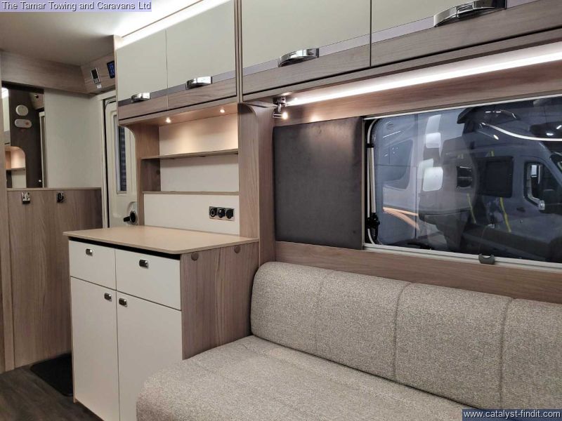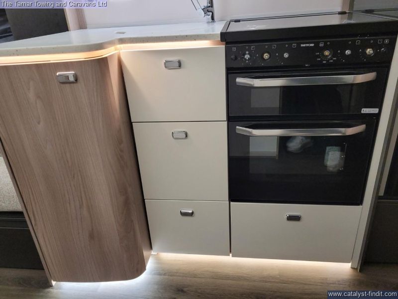 - 120W roof mounted solar panel External BBQ point Exclusive Duvalay Duvalite Strato mattress Solid surface kitchen worktop with flush fitting chopping board Dual hinged Dometic 133 litre tall slimline fridge with 12 litre removable freezer NEW two pull-out wire baskets in kitchen cupboard