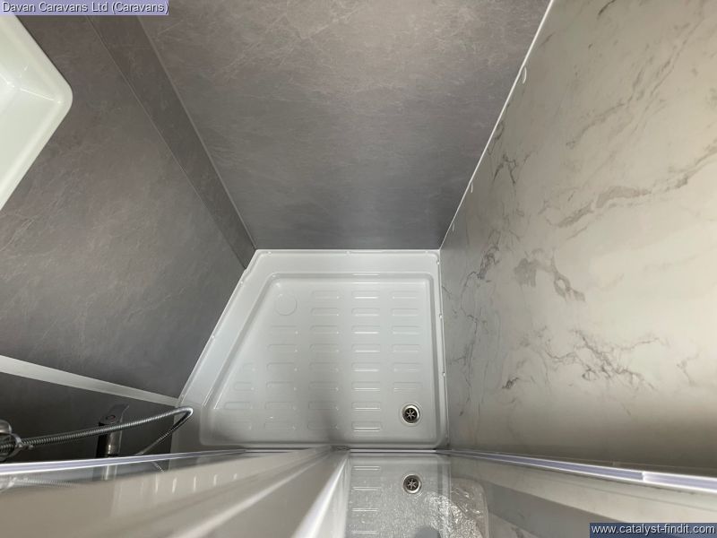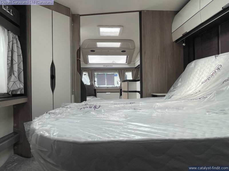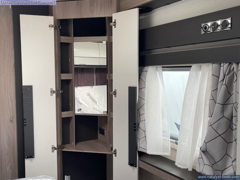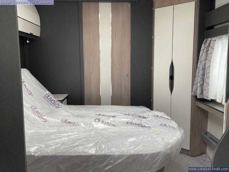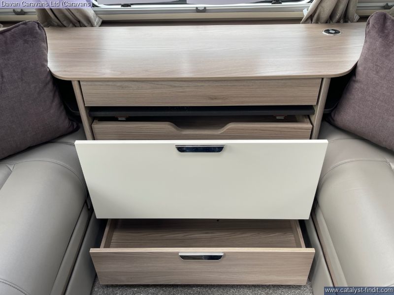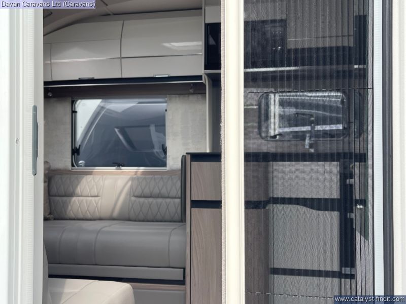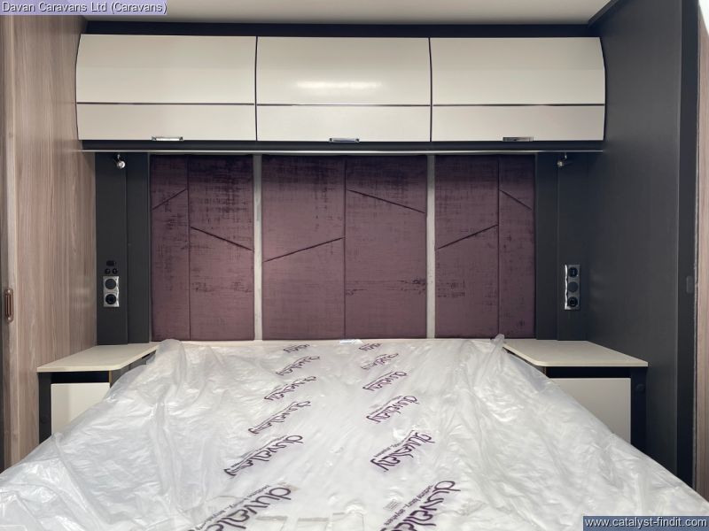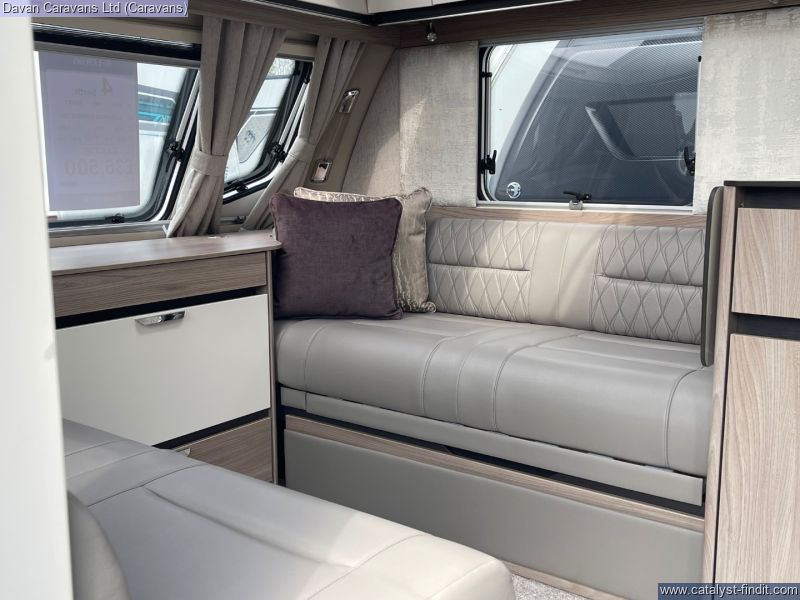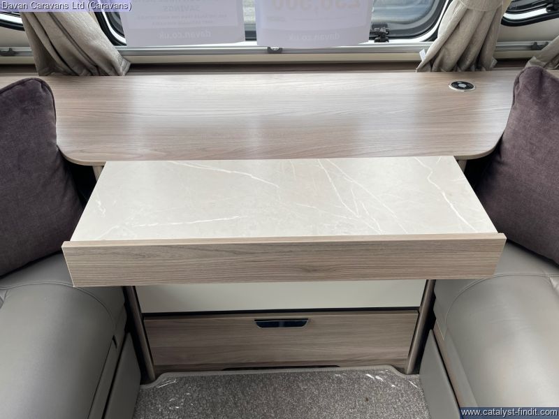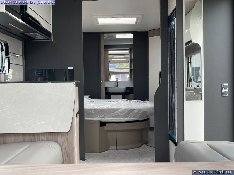 Step inside to discover a thoughtfully designed interior where space meets sophistication. The front lounge, framed by panoramic windows, offers a welcoming retreat bathed in natural light by day and transforms into a sumptuous double bed by night. At the heart of the living area, a fixed island bed provides hotel-style luxury with easy access from either side, while dual bedside cabinets and a full-height wardrobe keep your essentials neatly stowed.