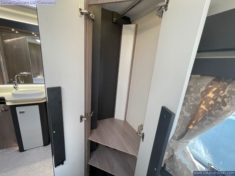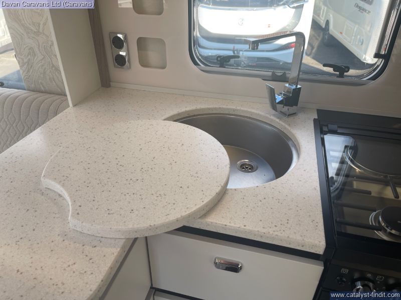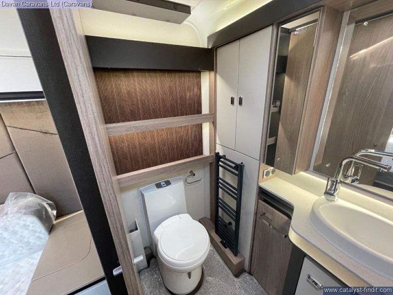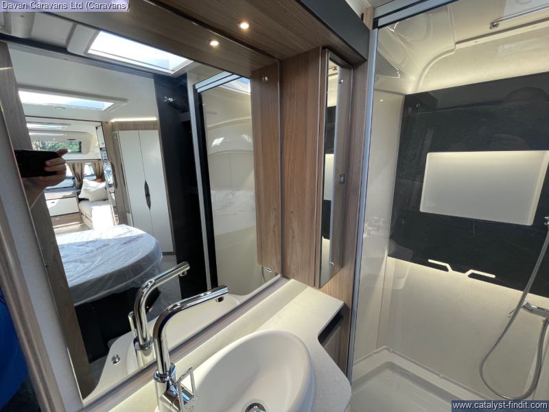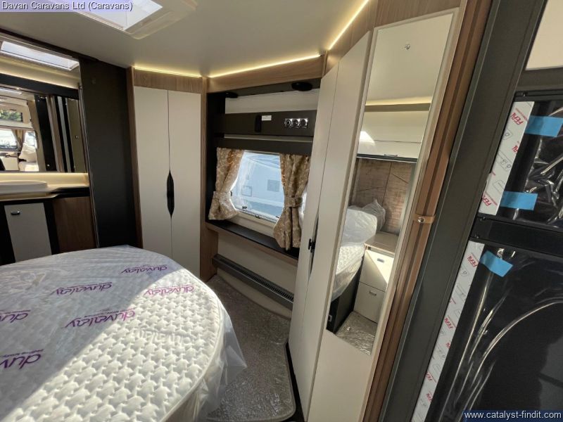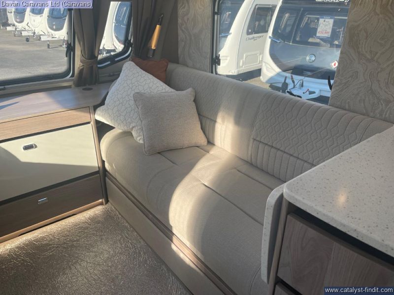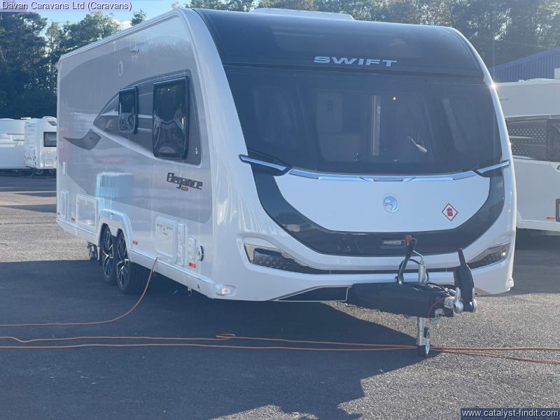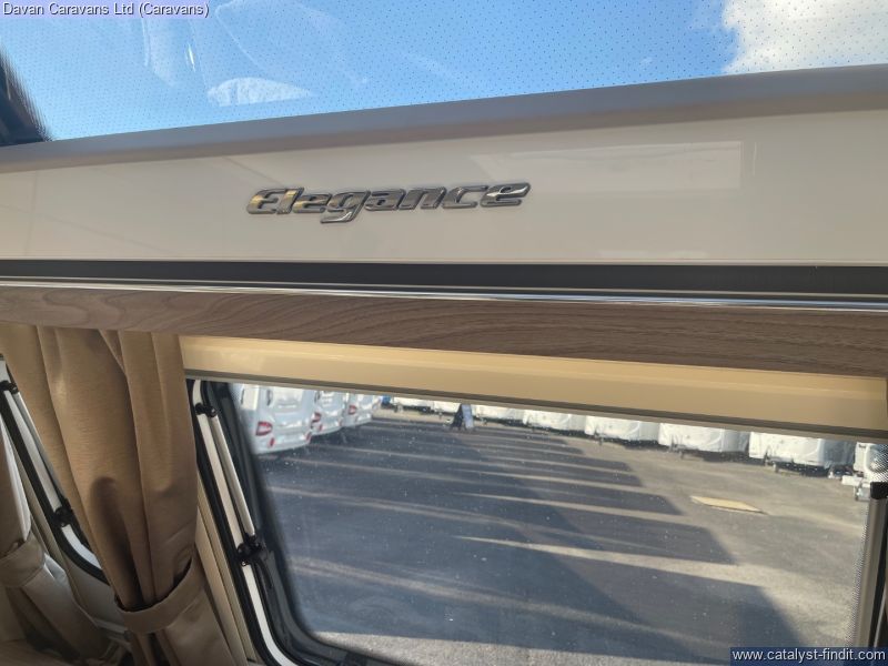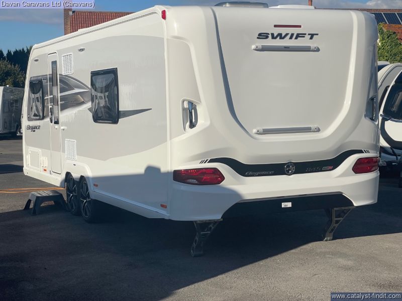 - The highest level of touring comfort and style. The Elegance Grande 845 is a caravan with a large rear washroom and spacious central bedroom all on an 8ft wide chassis. The Elegance range is made up all of 8ft wide layouts with refined finishes and boutique inspired design. From the superior Swift command control panel to the premium Duvalay Mattress, every detail is crafted for a luxurious experience ,perfect for all year round touring. Self levelling and roof mounted air conditioning are both factory fited options, if you order early enough.Enquire for details.