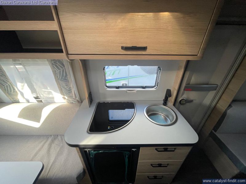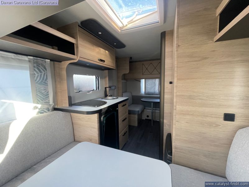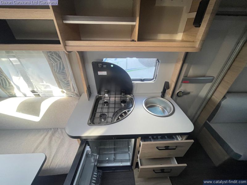 The layout is light, bright, and welcoming, with a front dinette that doubles as a cosy double bed, ideal for winding down after a day of exploring.Inside, you’ll find a well-equipped kitchen with everything you need to cook up a storm, from a gas hob to a spacious fridge, all wrapped in stylish finishes that feel modern yet homely. The washroom is compact but practical, with a shower and cassette toilet tucked neatly away. Throughout the caravan, smart storage solutions keep clutter at bay, making it easy to relax and enjoy the journey.Lightweight and easy to tow, the CaraOne 400LK is a great choice for families who want freedom without fuss.