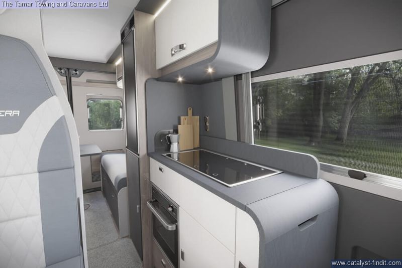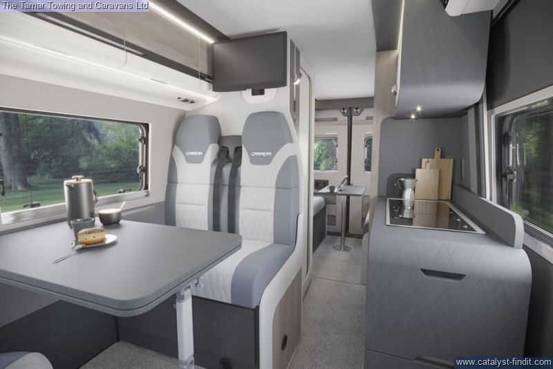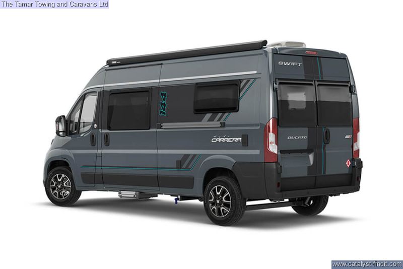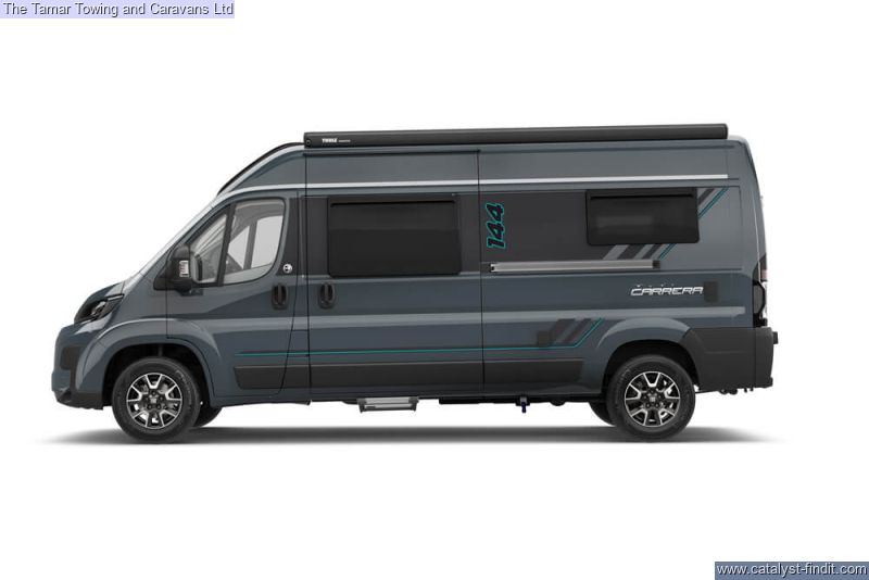 - The iconic Carrera makes its return for the 2025 season. This sleek panel van range is powered by the FIAT series Euro 6D Final 140bhp 2.2-litre engine, and comes with both ESC and Eco packs as standard. The Carrera is the perfect vehicle for daily use as well as for your adventurous getaways.Inside, you'll discover a completely reimagined interior that's both stylish and functional. The Ultra Leather® Montage soft furnishings offer a contemporary and comfortable living space, while the Sangallo Elm woodgrain furniture creates a light, airy atmosphere. A front sunroof adds to the sense of openness, flooding the interior with natural light.The front cab is designed for comfort during long journeys, featuring a new 10” HD touchscreen with a Sat Nav system, including TomTom 3D map visualization and selectable vehicle dimensions. Once you’ve arrived at your destination, the driver and passenger captain chairs can swivel to create additional lounge seating, perfect for family relaxation.The Carrera continues to impress with a unique wet room, complete with an Ecocamel Jetstorm showerhead that delivers a powerful shower while conserving water. A Micro-Heki skylight enhances the space, and the Whale water heating system ensures warmth throughout the year.Whether you're traveling as a couple or with family, there are six models of the Carrera to choose from this season. All feature a mid-kitchen and washroom, with four offering a rear lounge that converts into a comfortable double bed, while the 194 model has fixed rear drop-down beds. New this year is the 244, which includes a pop-top roof with a cozy double bed.