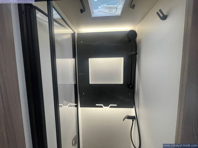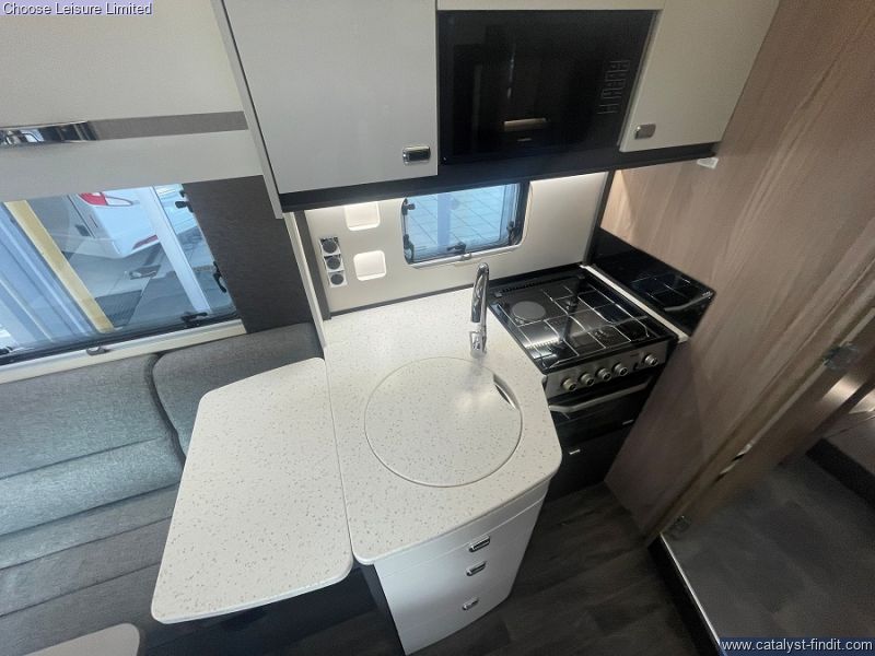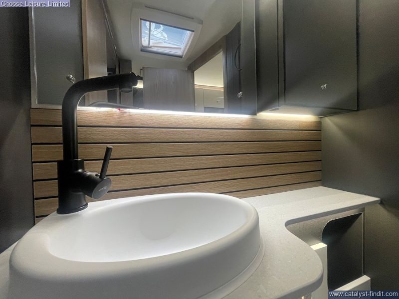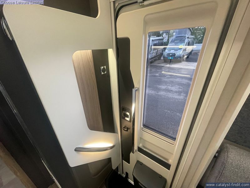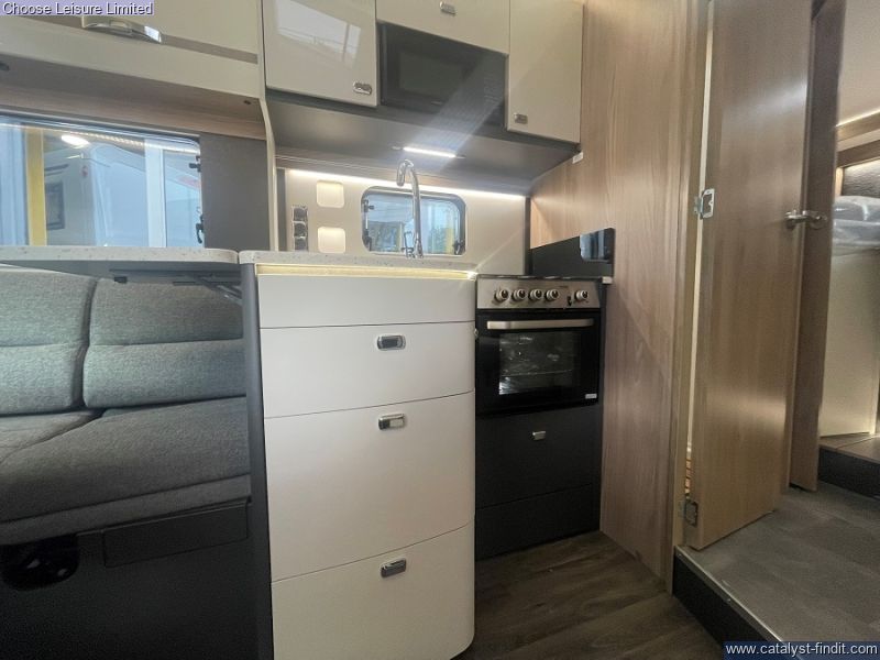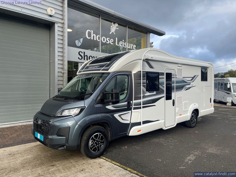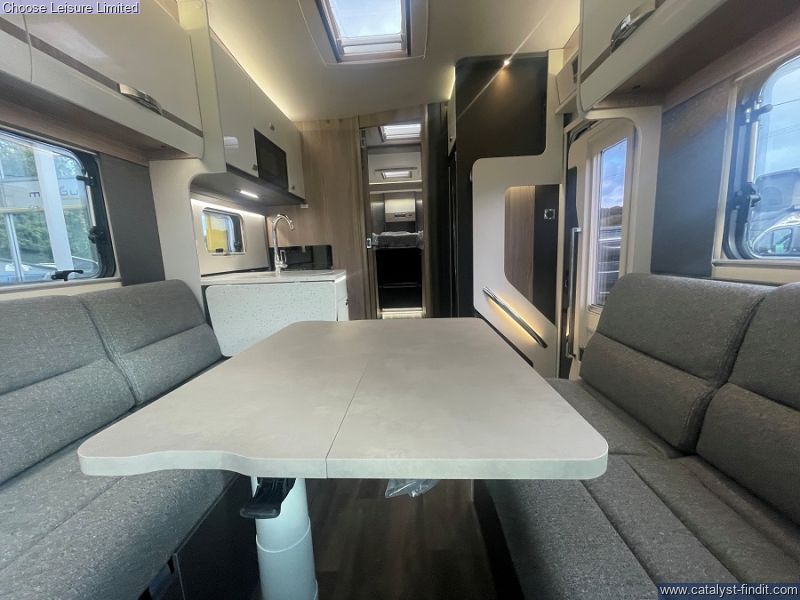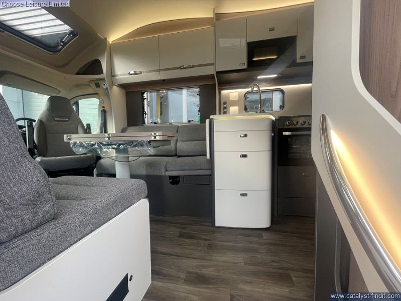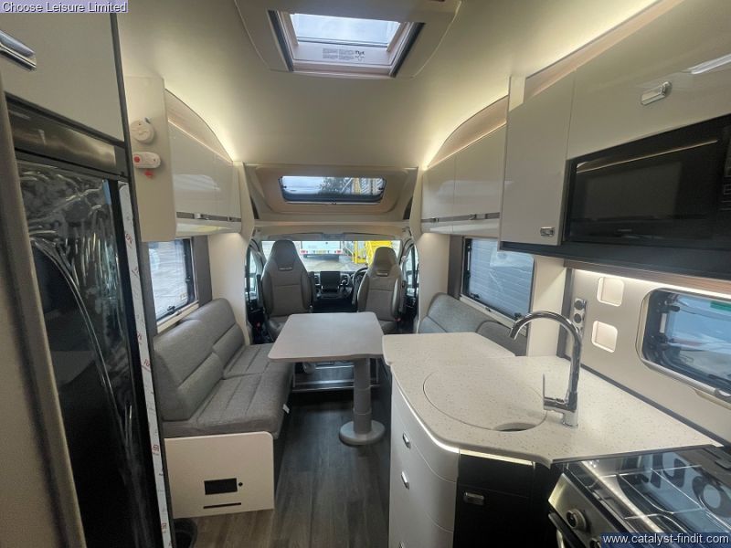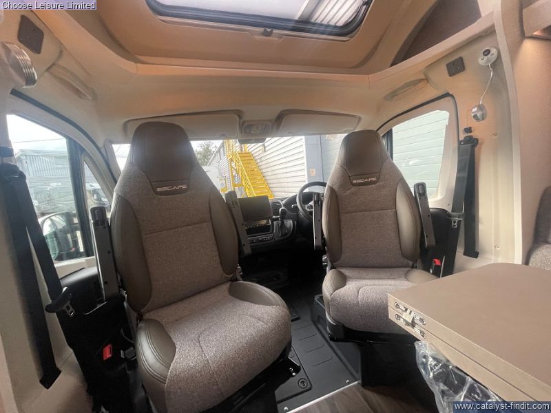 - Built with proprietary SMART construction, the Escape’s sleek profile now sits on a new Fiat chassis cab in metallic Iron Grey, featuring an updated front grill and body- coloured bumper, and is enhanced by a striking new exterior graphics scheme. Escape also features a garage space with services and interior access, plus a wide external entrance door with a window and central locking. Step inside and marvel at the revolutionised living space that enjoys a comfortable height of 2110mm and is designed with domestic-style seating in the parallel lounge. This includes space-efficient Aguti traveling seats, which incorporate cup holders and ISOfix for secure child seating, along with a rise and fall table. The stylish washroom with a dedicated shower continues to impress, featuring a Crema Bianca marble effect wallboard. The washroom has further enhanced storage which offers added storage space. In the kitchen area,Escape comes equipped with a Thetford Triplex combination oven and grill, a three-burner gas hob with an electric hotplate, and a Series 10 Dometic slim-line fridge-freezer, allowing fabulous meals to be enjoyed along the way. The kitchen also features a slate-weft laminate worktop and a Dometic flatbed microwave with digital controls. The Fiat cab now boasts an exclusive new 10” touchscreen HD color display, coupled with new Fiat Sat Nav with TomTom 3D map visualisation. This is encased within the sleek, black- trimmed dashboard design. Extra drivability is delivered via cruise control, ESC with Traction+ anti-slip regulation, hill descent control, and a new 8-speed automatic gearbox. Air conditioning, now with an automatic feature, maintains a comfortable environment, and a new wireless phone charger adds convenience. Make your great Escape today! Technical: