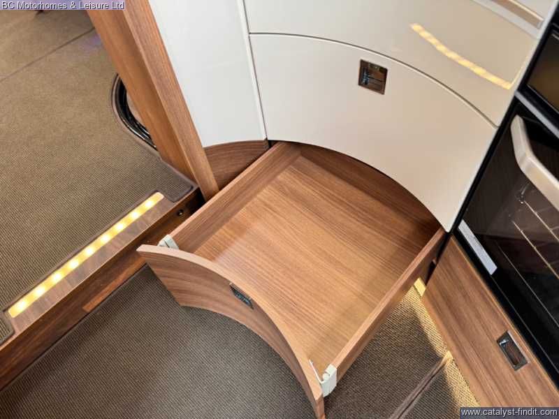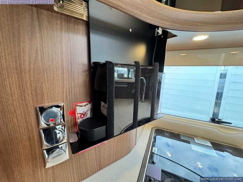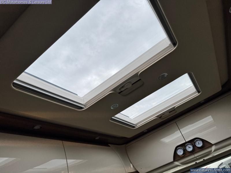 - Entrance step, passengers cabin access, retracted and extracted electrically silverline exterior colour scheme: front mask/ cabin completely in silver, (roof surfaces in white GRP to avoid undesirable heat effects) Eletrical awning (230 V) aluminium, grey canvas, length 6,0 m LED light strip at roof awning Socket package with additional sockets (3 x 230 V, 2 x USB) Exterior gas connection behind double floor exterior storage compartment at passenger side Gas oven with grill function in kitchen base unit Capsule coffee maker with connection set incl. capsule holder and cup set Service camera at waste water tank drain pipe Aluminium chequered floor for scooter garage Linea chiara world of style Carpet for living area Carpet for driver cabin area Wohnraumtisch ausziehbar “Sky Dream Comfort” driver’s cab incl. two panoramic skylights (instead of drop-down bed) Lounge seating area can be converted into a sleeping area 4th seat in L seating group: footrest Sand Performance leather World of sleeping & decoration set: decorative cushions, house blanket, fitted sheet set